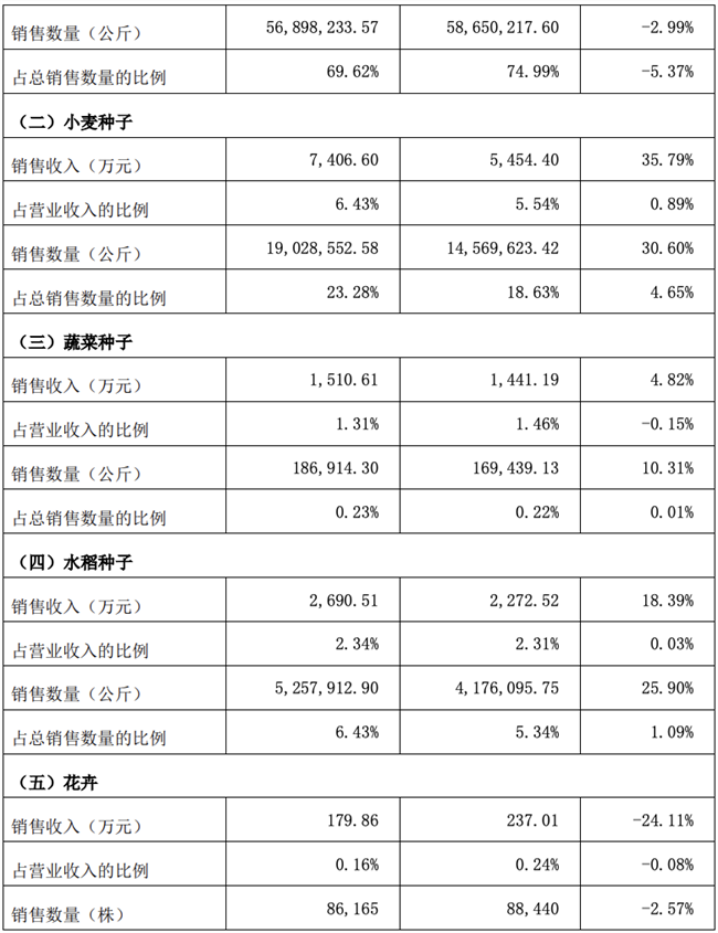 登海種業(yè)營收前五種子分別是玉米、小麥、蔬菜、水稻、花卉,其中玉米種子銷售收入10.15億元,同比增長16.13%,占營業(yè)收入的比例88.07%,占總銷售數(shù)量69.62%,