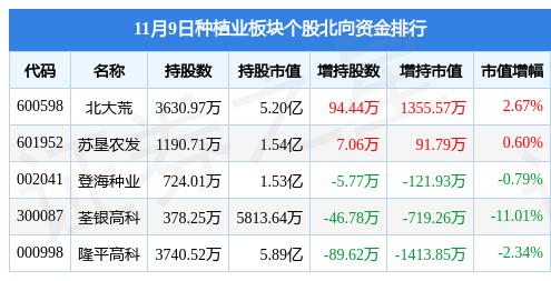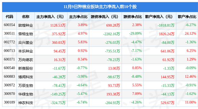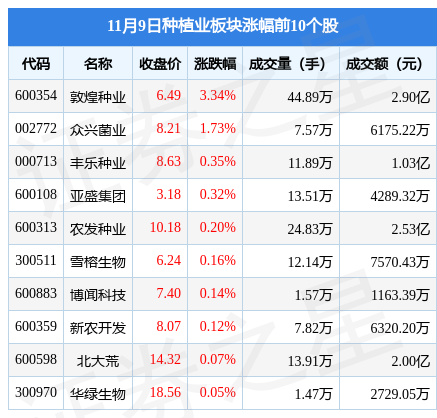 種植業(yè)板塊11月9日漲0.23%,敦煌種業(yè)領漲,主力資金凈流出1.06億元;