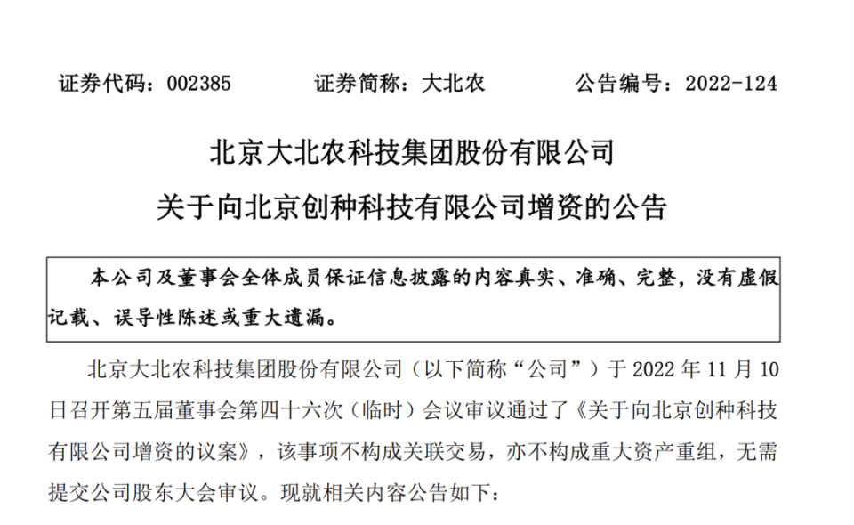 11月11日晚間,大北農(nóng)發(fā)布公告,公司全資子公司北京創(chuàng)種科技有限公司擬以資本公積轉(zhuǎn)增股本,轉(zhuǎn)增額度為5億元。同時(shí),公司擬使用自有資金4億元向創(chuàng)種科技增資。本次創(chuàng)種科技資本公積轉(zhuǎn)增股本及公司向其增資完成后,創(chuàng)種科技的注冊資本將由1億元變更為10億元,創(chuàng)種科技仍為公司全資子公司。