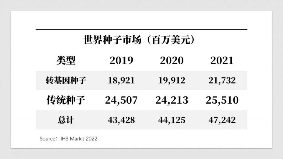 盡管僅有 19% 的作物面積,但轉(zhuǎn)基因種子在 2021 年占商業(yè)種子市場(chǎng)銷售額的 46%。