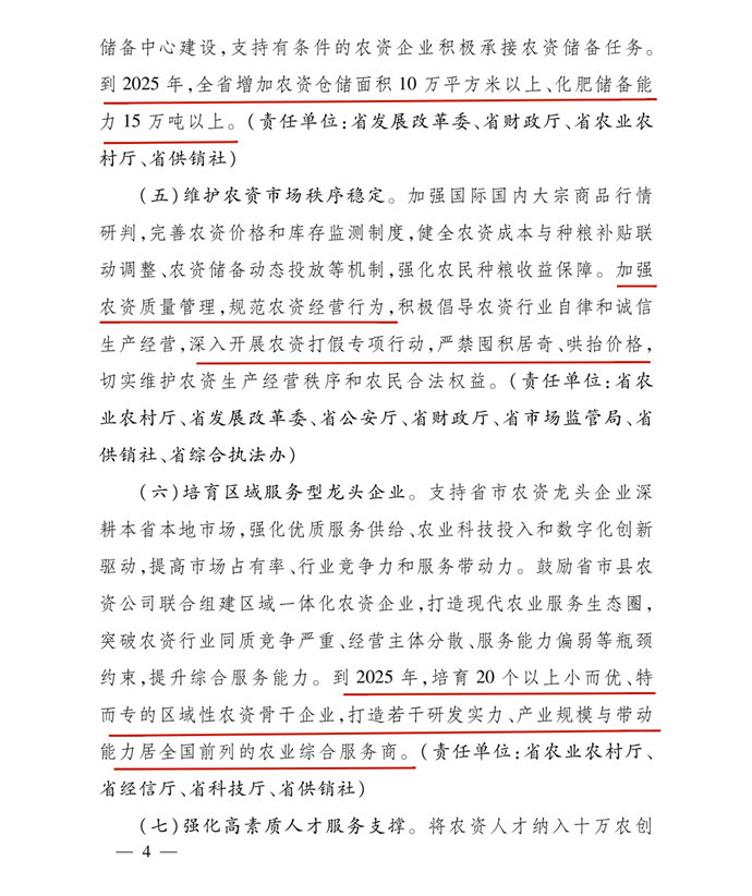《意見》明確了總體要求、重點任務、保障措施等內(nèi)容。主要目標是加快構建供銷合作社主導、龍頭企業(yè)牽引、各類農(nóng)資經(jīng)營服務主體聯(lián)合合作的現(xiàn)代農(nóng)資經(jīng)營服務體系。力爭經(jīng)過5~10年發(fā)展,浙江省農(nóng)資經(jīng)營服務專業(yè)化體系化數(shù)字化水平顯著提升,農(nóng)資倉儲物流配送一體化取得實質(zhì)性進展,一批創(chuàng)新型農(nóng)資“鏈長”企業(yè)發(fā)展壯大,與保障糧食安全、發(fā)展現(xiàn)代農(nóng)業(yè)需求相匹配的農(nóng)資產(chǎn)業(yè)和供應鏈體系基本形成。