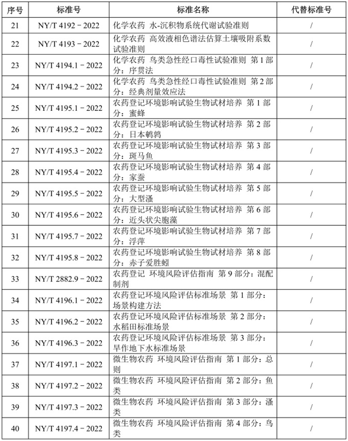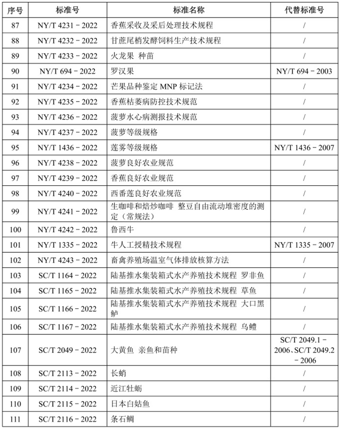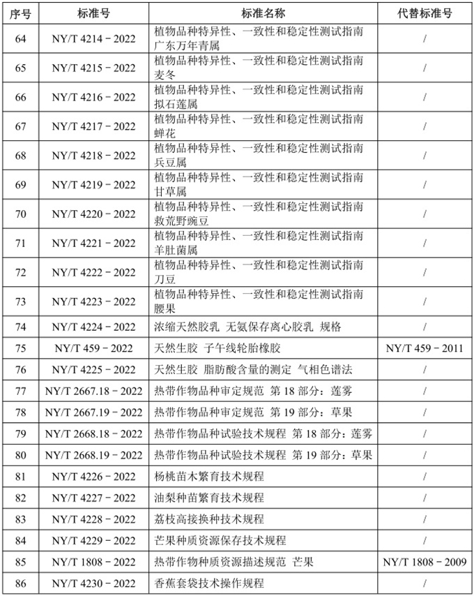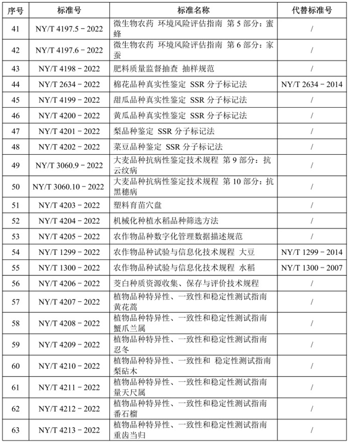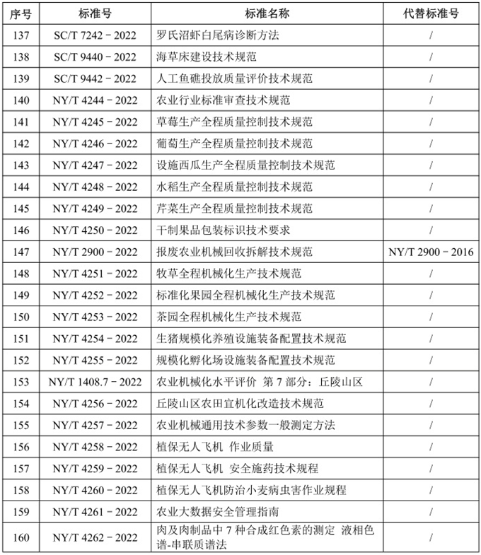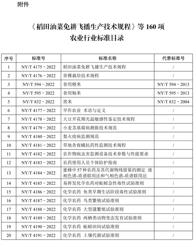 《稻田油菜免耕飛播生產技術規(guī)程》等160項標準業(yè)經專家審定通過,現批準發(fā)布為中華人民共和國農業(yè)行業(yè)標準,自2023年3月1日起實施。標準編號和名稱見附件。該批標準文本由中國農業(yè)出版社出版,可于發(fā)布之日起2個月后在中國農產品質量安全網(http://www.aqsc.org)查閱。