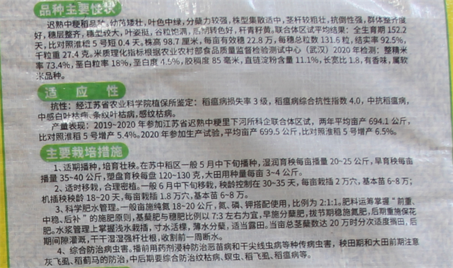 一看作物種類、種子類別、品種名稱、審定編號。如:作物種類:水稻;種子類別:大田用種;品種名稱:楊香玉1號;審定編號:蘇審稻20210056,從審定編號上也能看出是不是新品種。