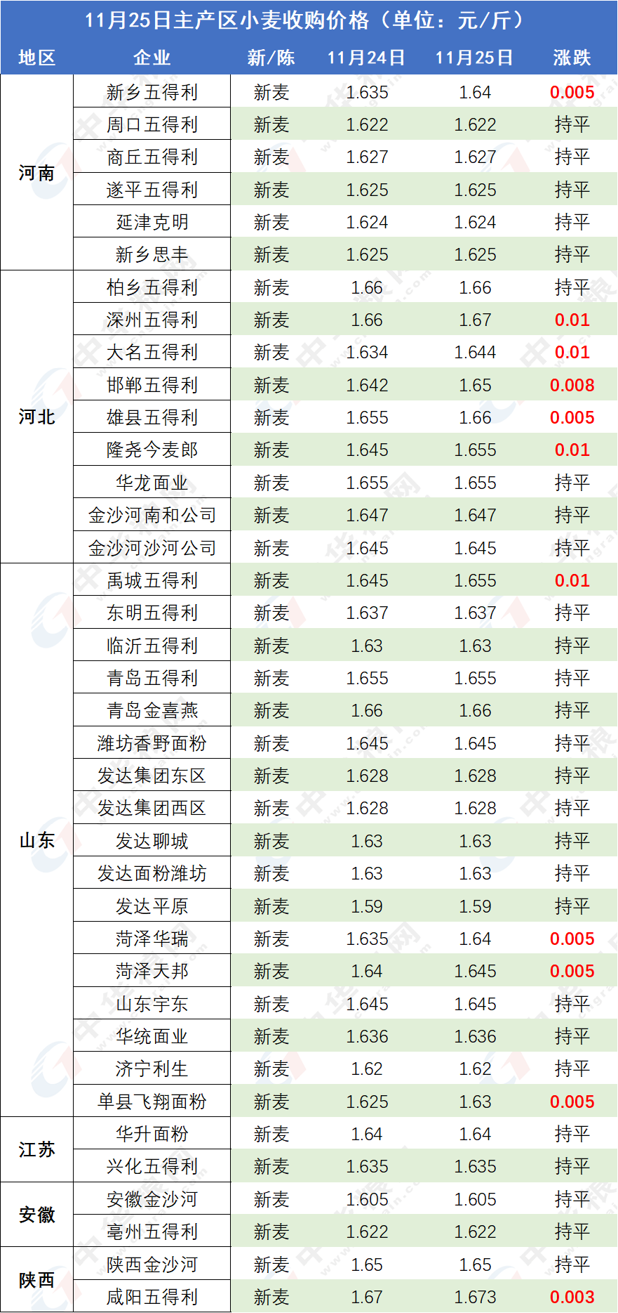 11月25日主產(chǎn)區(qū)小麥?zhǔn)召?gòu)價(jià)格