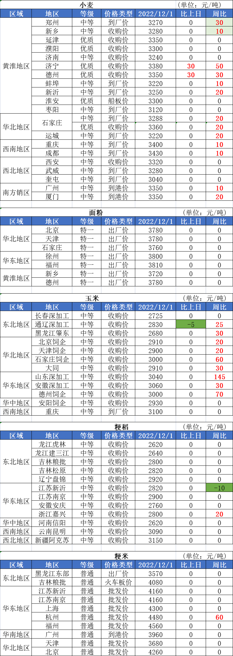 1、11月30日,新疆臨儲(chǔ)小麥拍賣共投放39709噸,全部成交。其中白小麥26507噸,成交均價(jià)3036元/噸;高寒白小麥10568噸,成交均價(jià)2212元/噸;混合麥2634噸,成交均價(jià)2745元/噸。