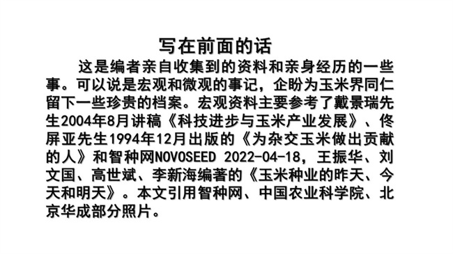 這是編者親自收集到的資料和親身經(jīng)歷的一些事??梢哉f是宏觀和微觀的事記,企盼為玉米界同仁留下一些珍貴的檔案。宏觀資料主要參考了戴景瑞先生2004年8月講稿《科技進步與玉米產(chǎn)業(yè)發(fā)展》、佟屏亞先生1994年12月出版的《為雜交玉米做出貢獻的人》和智種網(wǎng)NOVOSEED 2022-04-18,王振華、劉文國、高世斌、李新海編著的《玉米種業(yè)的昨天、今天和明天》。本文引用智種網(wǎng)、中國農(nóng)業(yè)科學(xué)院、北京華成部分照片。