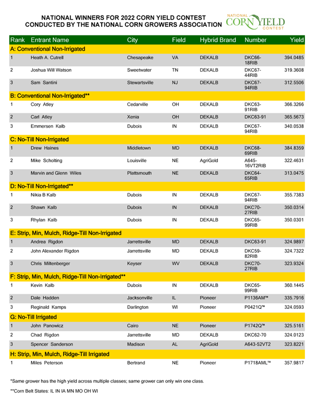 全國(guó)或者全州的組內(nèi)產(chǎn)量最高的前 3 名為優(yōu)勝者。2022年 12 月 15日 NCGA 公布最終結(jié)果。