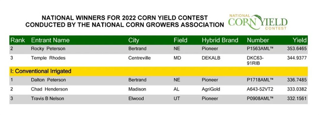 馬里蘭州Middletown的Drew Haines在比賽中獲得了第二高的產(chǎn)量,他的免耕非灌溉田達(dá)到了384.8359 bpa。內(nèi)布拉斯加州Bertrand的Miles Peterson獲得了最高的灌溉產(chǎn)量,他將一塊帶狀耕作的灌溉田推至357.9817 bpa。