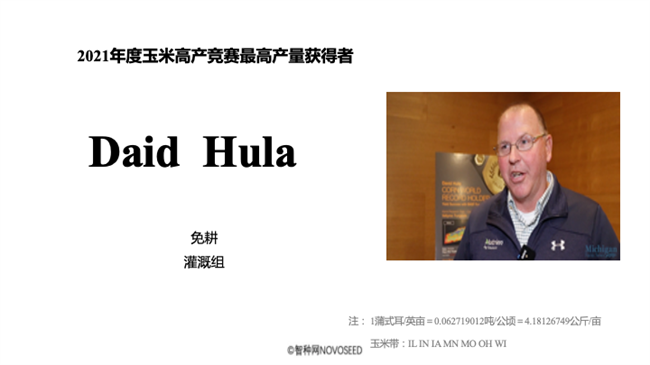 2022 年競(jìng)賽最高產(chǎn)量 2517.83 公斤/畝,由弗吉尼亞州查爾斯市的玉米種植者大衛(wèi)·胡拉 (David Hula)在免耕灌溉組田塊創(chuàng)造。品種為先鋒公司 P1222YHR 產(chǎn)量為 602.16 蒲式耳/英畝。他在2019年美國(guó)玉米產(chǎn)量競(jìng)賽創(chuàng)下每英畝616.1953蒲式耳的美國(guó)玉米高產(chǎn)紀(jì)錄,折合2576.48公斤/畝。