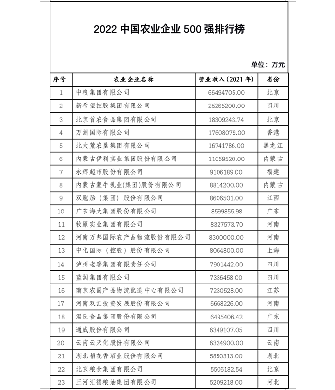 為全面、客觀、系統(tǒng)展現(xiàn)我國農(nóng)業(yè)企業(yè)發(fā)展情況,營造農(nóng)業(yè)企業(yè)參與鄉(xiāng)村振興和建設(shè)農(nóng)業(yè)強國的良好社會氛圍,農(nóng)民日報社發(fā)起2022中國農(nóng)業(yè)企業(yè)500強評價活動,經(jīng)信息匯集、嚴格審核、專家評議等程序,形成了《2022中國農(nóng)業(yè)企業(yè)500強》(公示版)。