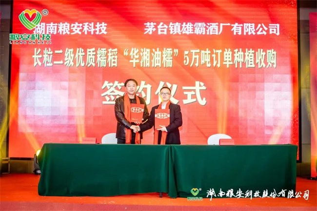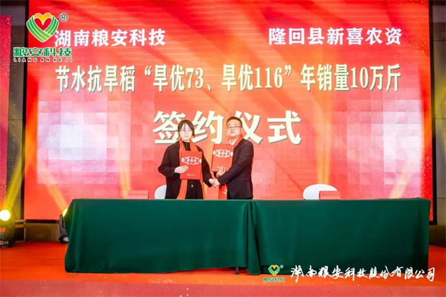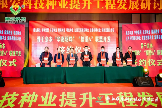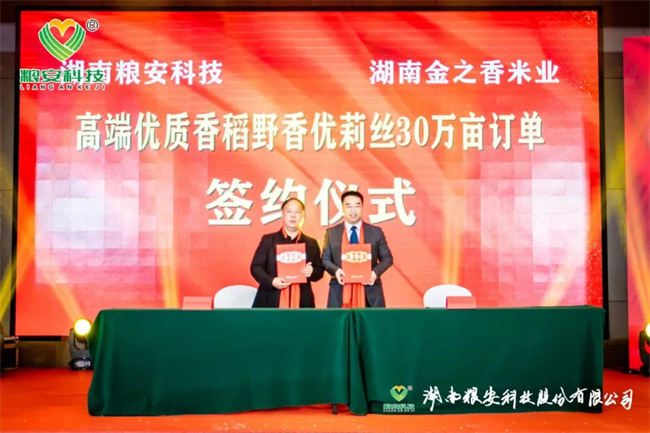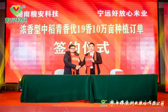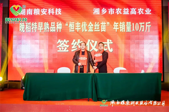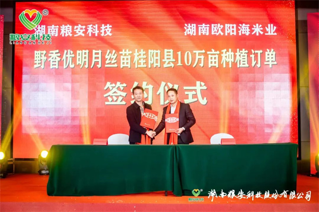 加強(qiáng)合作、實(shí)現(xiàn)共贏,是湖南糧安科技股份有限公司永恒不變的追求。本次研討會(huì)進(jìn)行了九輪戰(zhàn)略合作現(xiàn)場(chǎng)簽約儀式,它們分別是:與廣發(fā)銀行邵陽(yáng)市分行首期2500萬(wàn)授信簽約;與湖南金之香米業(yè)有限公司高端優(yōu)質(zhì)香稻野香優(yōu)莉絲南縣30萬(wàn)畝訂單簽約;與中化現(xiàn)代(湖北)有限公司高端優(yōu)質(zhì)香稻野香優(yōu)航1573漢壽縣10萬(wàn)畝種植訂單簽約;與湖南歐陽(yáng)海米業(yè)有限公司高端優(yōu)質(zhì)香稻野香優(yōu)明月絲苗桂陽(yáng)縣10萬(wàn)畝種植訂單簽約;與湖南好放心米業(yè)有限公司濃香型中稻青香優(yōu)19香寧遠(yuǎn)縣10萬(wàn)畝種植訂單簽約;與湘鄉(xiāng)市農(nóng)益高農(nóng)業(yè)發(fā)展有限公司晚稻特早熟品種恒豐優(yōu)金絲苗年銷(xiāo)量10萬(wàn)斤簽約;與隆回縣新喜農(nóng)資經(jīng)營(yíng)有限公司節(jié)水抗旱稻旱優(yōu)73、旱優(yōu)116年銷(xiāo)量10萬(wàn)斤簽約;與茅臺(tái)鎮(zhèn)雄霸酒廠有限公司長(zhǎng)粒優(yōu)質(zhì)糯稻華湘油糯5萬(wàn)噸訂單種植收購(gòu);與中種集團(tuán)、合肥豐樂(lè)種業(yè)、廣西綠海種業(yè)、廣東粵良種業(yè)、江西天稻糧安種業(yè)、湖南岳麓山水稻等單位簽約公司骨干親本“華湘明珠”和“檀香A”聯(lián)合開(kāi)發(fā)框架協(xié)議。九輪現(xiàn)場(chǎng)簽約將本次研討會(huì)推向一個(gè)激動(dòng)人心的高潮。