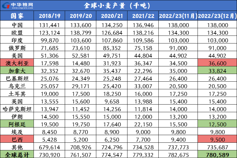 烏克蘭已經(jīng)完成了2022年的小麥和大麥?zhǔn)崭?,產(chǎn)量分別為1940萬和560萬噸。截至12月15日,谷物總收成接近4500萬噸。作為對比,烏克蘭農(nóng)業(yè)部預(yù)測谷物收成為5100萬噸。谷物出口供應(yīng)估計(jì)為4920萬噸,其中可能包括1630萬噸小麥,具體出口量取決于物流情況。