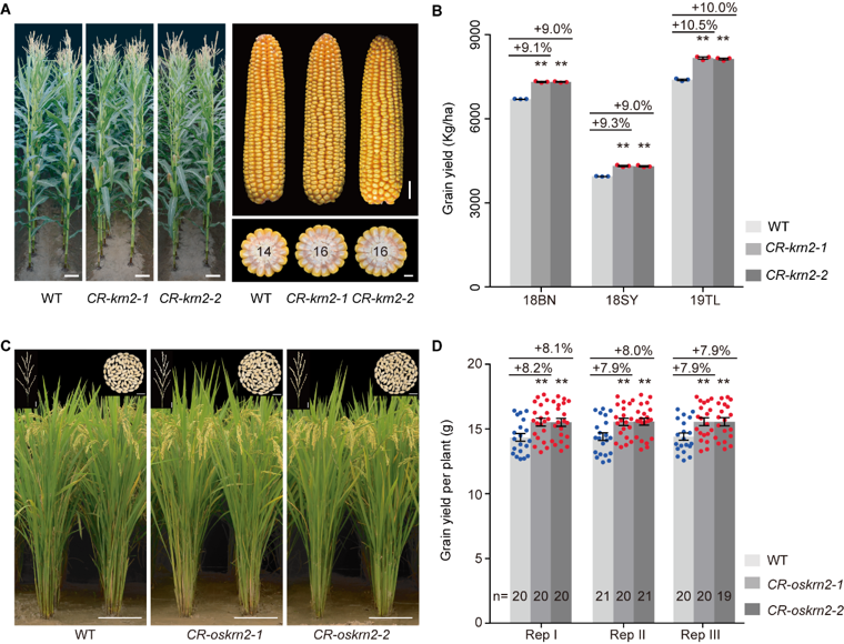 該研究還利用基因編輯技術(shù)創(chuàng)制了KRN2和OsKRN2基因功能敲除的新材料。多年多點(diǎn)的田間小區(qū)試驗(yàn)表明,玉米KRN2敲除系和水稻OsKRN2敲除系可分別提高10%的玉米產(chǎn)量和8%的水稻產(chǎn)量,并且對(duì)其它農(nóng)藝性狀沒有明顯的負(fù)面影響,展現(xiàn)了巨大的應(yīng)用潛力。