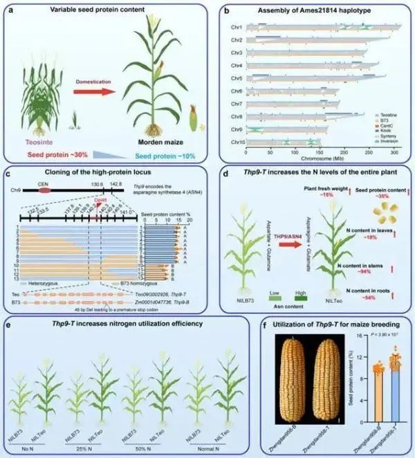 中國科學(xué)院分子植物科學(xué)卓越創(chuàng)新中心和上海師范大學(xué)科研團(tuán)隊(duì)合作,在三亞進(jìn)行了大規(guī)模田間試驗(yàn),將野生玉米高蛋白基因Thp9-T雜交導(dǎo)入我國推廣面積最大的玉米生產(chǎn)栽培品種“鄭單958”中,可顯著提高蛋白含量,表明該基因在培育高蛋白玉米中具有重要的應(yīng)用潛能。同時(shí),在減少氮肥施用條件下可以有效保持玉米的生物量,以及植株和籽粒中氮含量水平,這對(duì)于減少化肥使用和保護(hù)生態(tài)環(huán)境具有重要意義。