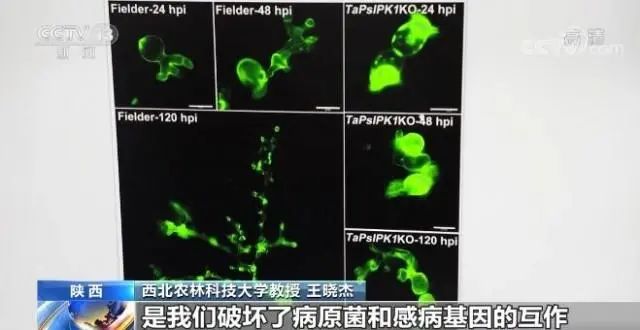 西北農(nóng)林科技大學(xué)教授王曉杰表示,這是我們?cè)跓晒怙@微鏡下觀察到的病菌的生長發(fā)育情況,左邊這一列是在正常情況下,條銹菌侵染小麥后產(chǎn)生的一些侵染結(jié)構(gòu),而在這一列是我們破壞了病原菌和感病基因的互作,病菌的生長發(fā)育受到了嚴(yán)重的抑制。“我們通過讓感病基因和病原菌的毒性基因不能碰面,就是讓病菌不能去操縱感病基因,實(shí)現(xiàn)了抗病材料的創(chuàng)制。”王曉杰說。