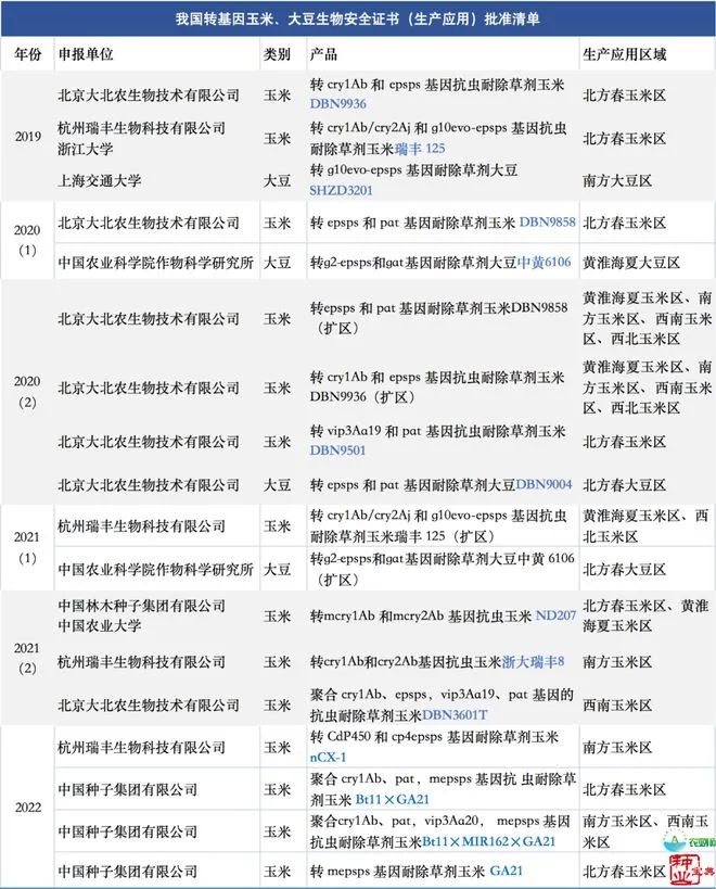 4月29日,農(nóng)業(yè)農(nóng)村部發(fā)布了2022年第一批轉(zhuǎn)基因生產(chǎn)應(yīng)用安全證書,其中包括4個(gè)轉(zhuǎn)基因玉米。截至目前,我國已有11個(gè)轉(zhuǎn)基因抗蟲耐除草劑玉米和3 個(gè)轉(zhuǎn)基因耐除草劑大豆獲得生產(chǎn)應(yīng)用安全證書。