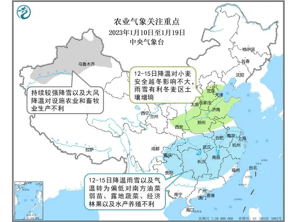 中央氣象臺(tái)發(fā)布消息,11~15日降溫雨雪不利南方地區(qū)農(nóng)業(yè)生產(chǎn)。本周,新疆大部、內(nèi)蒙古中西部、西北地區(qū)中東部以及東北地區(qū)氣溫接近常年或偏高1~4℃,氣象條件總體利于設(shè)施農(nóng)業(yè)和畜牧業(yè)生產(chǎn);新疆北部出現(xiàn)了持續(xù)性降雪,且積雪深度在20~50厘米的范圍較上周有所擴(kuò)大,部分地區(qū)牲畜采食受到影響。北方冬麥區(qū)氣溫偏高2~4℃,大部土壤墑情適宜,對(duì)冬小麥安全越冬較為有利。江淮、江漢、江南、華南以及西南地區(qū)東部氣溫接近常年同期或偏高、日照正?;蚱?,氣象條件總體利于油菜、冬小麥緩慢生長(zhǎng),露地蔬菜生產(chǎn)以及經(jīng)濟(jì)林果采收、儲(chǔ)運(yùn)。周末,云南中北部出現(xiàn)霜凍天氣,部分露地蔬菜、經(jīng)濟(jì)林果、蠶豆等遭受輕微凍害。