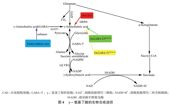 在水稻中,以谷氨酸為前體物質,經(jīng)過谷氨酸脫羧酶和谷氨酸脫氫酶的聯(lián)合作用轉化為γ-氨基丁酸,此外,一部分GABA通過多胺衍生途徑和GABA分解作用,以鳥氨酸作為前體物質進行合成(圖4)。有研究者指出利用RNA干擾技術,構建OsGABA-T1RNi載體,導入寧粳1號中,降低OsGABA-T1的表達,導致糙米和精米中GABA的含量相對于寧粳1號增加;利用N-甲基-N亞硝基對金南風進行誘變處理,從而得到了巨大胚突變體ge,相對于原品種胚增加2~3倍。另有研究者指出利用95-20為父本、巨胚稻花晴M-2-565-11-3-B為母本選育出GABA含量為7.8mg/100g的巨胚粳1號;對高產(chǎn)糯稻恢復系嘉糯恢2號采用Co60輻射得到的福巨糯2號與巨胚不育系TgeA、1813geA進行組配,獲得了富含GABA的巨胚雜交稻組合T優(yōu)巨胚2號和1813優(yōu)巨胚2號;以黑帥為母本,與巨胚1號/早25雜交,得到GABA含量較高并且具有降壓功能的黑珍珠。有研究者提出巨胚稻中的γ-氨基丁酸含量高于常規(guī)稻米。通過對黑龍江7個粳稻品種的研究,篩選出了肯糯2以及龍粳31兩個富含γ-氨基丁酸的品種。此外,富含GABA的水稻品系還有Haiminori、龍?zhí)仄諥和龍?zhí)仄諦的突變體、巨胚一號、伽馬-1、奧羽359、巨胚香糯1547、墾糯2號、6601、白巨胚米1575、MhgeR和西巨胚1號等。