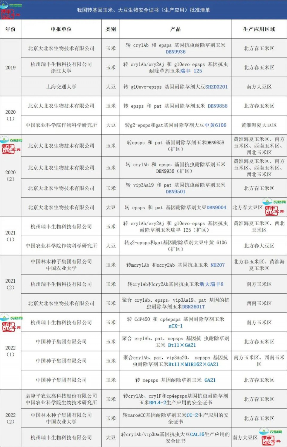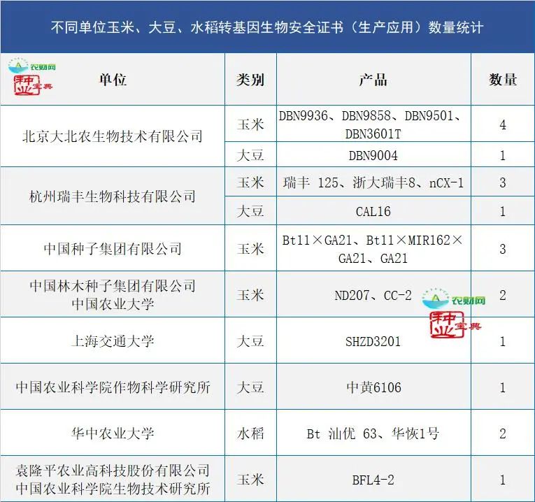 2023年1月13日,農(nóng)業(yè)農(nóng)村部頒布2個轉(zhuǎn)基因玉米及1個大豆生物安全證書(生產(chǎn)應用)。在最新的批轉(zhuǎn)清單發(fā)布后,我國擁有生物安全證書的商業(yè)化主體再添新成員。