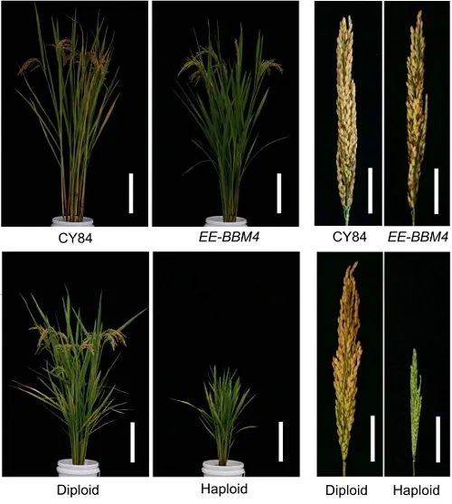 上圖為BBM4異位表達(dá)植株與野生型CY84表型比較;下圖為孤雌生殖植株的二倍體后代及單倍體后代表型比較。