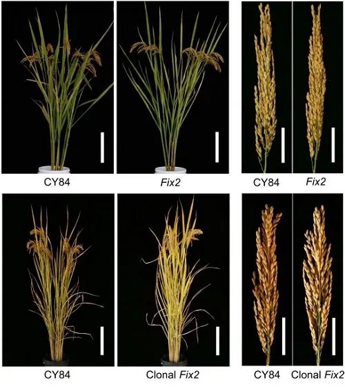 無融合生殖雜交水稻Fix2第一代(上圖)、第二代(下圖)與野生型CY84表型比較。