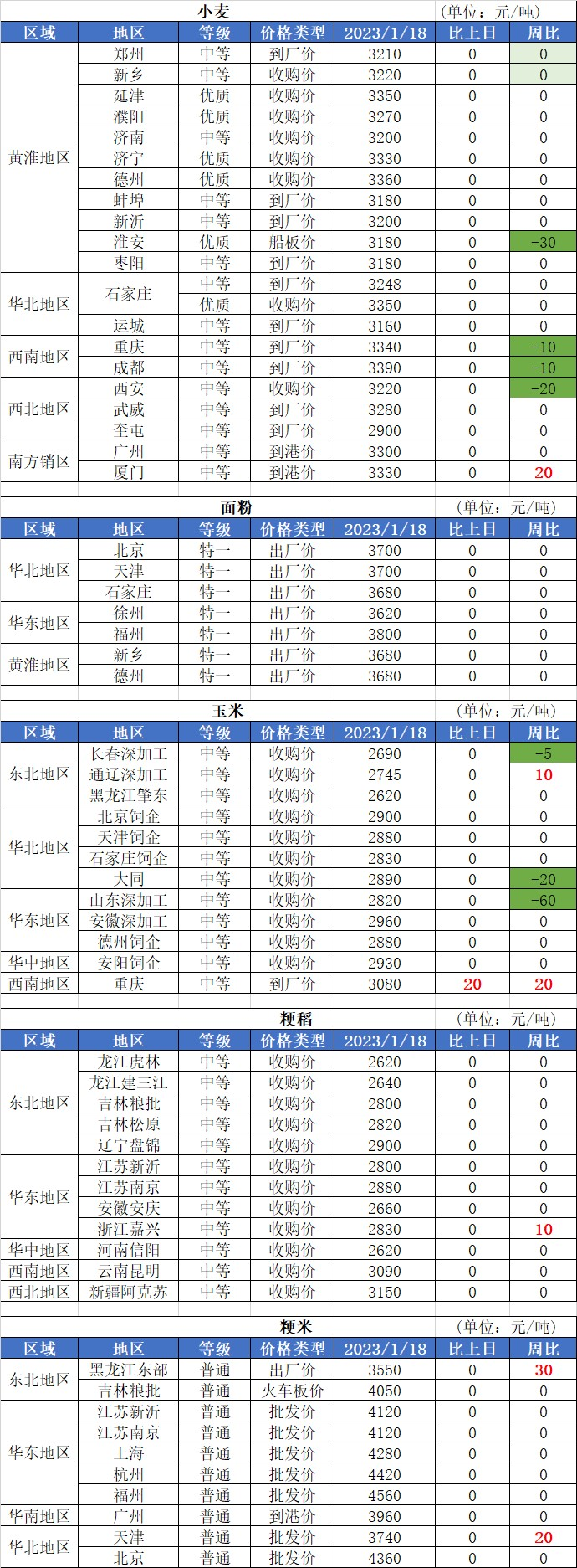 1、1月18日,最低收購價小麥拍賣共投放100469噸,全部成交。其中河北白小麥6697噸,成交均價3105元/噸;河南混合麥89582噸,成交均價2939元/噸;陜西混合麥4190噸,成交均價3047元/噸。