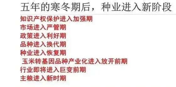 2022年-2023年度,我國(guó)玉米將進(jìn)入一個(gè)嶄新的周期,市場(chǎng)和行業(yè)形勢(shì)發(fā)生了巨大變化:知識(shí)產(chǎn)權(quán)保護(hù)進(jìn)入加強(qiáng)期,市場(chǎng)進(jìn)入嚴(yán)管期,政策進(jìn)入利好期,品種進(jìn)入換代期,企業(yè)進(jìn)入加快淘汰期,玉米轉(zhuǎn)基因品種產(chǎn)業(yè)化進(jìn)入開放前期,行業(yè)即將進(jìn)入巨變前期,主糧進(jìn)入新時(shí)期。