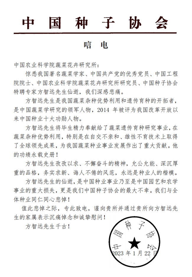 我國著名蔬菜學(xué)家,中國工程院院士,中國農(nóng)業(yè)科學(xué)院蔬菜花卉研究所研究員方智遠(yuǎn),因病醫(yī)治無效,于2023年1月20日晚在北京逝世,享年84歲。