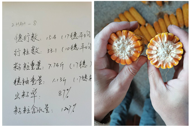 22HAH-8,隨機排列,3次重復(fù),只找到二個。22HAH-8,第一排,鳥啄了,出苗不好,17個果穗,平均穗重0.44斤。22HAH-439,中間二行,收了40穗,不缺苗,平均單穗重0.39斤,5000株/畝,有2個小穗,可能是二穗。單穗若平均0.4斤,畝產(chǎn)將達到1000kg。說明這個品種(黎民196)適宜密度在3500-5000株/畝之間。單穗重0.44斤,3500株密度也可能達到800kg。