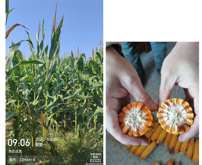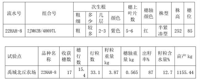 凡是今年到過禹城北丘試驗基地的老師和專家都對 8 號(22HAH-8)印象深刻。過后好長時間,許多老師還在問雜優(yōu)模式和產(chǎn)量結(jié)果。22HAH-8 別具一格,與眾不同,植株低,穗位超低,莖稈細,拖著一個大穗子,小馬拉大車,育種家感到奇特。