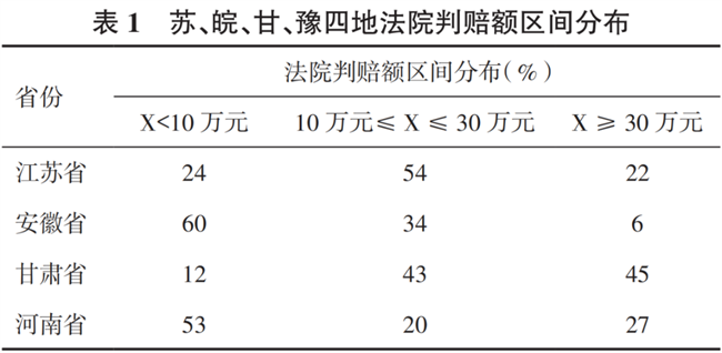 分析樣本中,判賠額小于10萬(wàn)元的案件占33%、大于等于10萬(wàn)元且小于等于30萬(wàn)元的占41%、大于30萬(wàn)元的占26%,判賠額在30萬(wàn)元以下的占了大多數(shù)。所選各省的判賠額區(qū)間分布具有明顯不同(表1),各地的平均判賠額由高到低分別是:甘肅544690元、江蘇341935元、安徽131852元、河南107416元[未計(jì)入河南金博士種業(yè)股份有限公司訴北京德農(nóng)種業(yè)有限公司、河南省農(nóng)業(yè)科學(xué)院侵害植物新品種權(quán)糾紛案(該案最終判賠4952萬(wàn)元,參見(jiàn)河南省高級(jí)人民法院(2015)豫民終356號(hào)民事判決書)]。總之,從絕對(duì)數(shù)字來(lái)看,低額判賠案件較多、且區(qū)域差異較大。