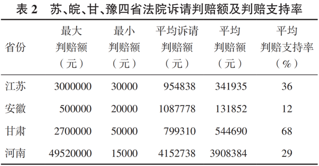 需要說(shuō)明的是,侵權(quán)損害賠償?shù)慕^對(duì)判賠數(shù)額與侵權(quán)所造成損失的大小、原告的請(qǐng)求等都有直接關(guān)聯(lián)。換言之,若損害賠償數(shù)額的確定方式不是主要依據(jù)法定賠償,則絕對(duì)值對(duì)比度意義不大;而是要進(jìn)一步對(duì)比法院對(duì)原告訴請(qǐng)賠償數(shù)額的支持率。在分析樣本中,原告均明確主張了侵權(quán)損害賠償?shù)木唧w數(shù)額,但蘇、皖、甘、豫四地法院的支持率同樣存在較大差異(表2)。其中,甘肅法院判賠支持率明顯高于其他三省法院,安徽法院平均判賠支持率最低,江蘇、河南都曾出現(xiàn)高額賠償且判賠支持率為100%的裁判。