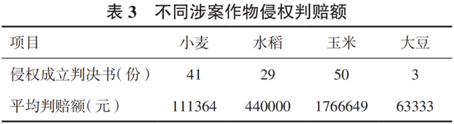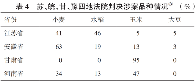 在分析樣本中,涉案品種最多的是小麥、水稻、玉米和大豆4種作物,在分析樣本中所占比重依次為33%、23%、40%、2%。僅從適用法定賠償?shù)牟门衼?lái)看,侵害玉米品種權(quán)平均判賠額最高,其次是水稻、小麥、大豆(表3)。進(jìn)一步分析可知,在蘇、皖、甘、豫四地法院裁判的案件中,涉及上述品種權(quán)侵權(quán)案件的分布及占比差異很大。江蘇涉案品種中水稻占比最高、約46%,安徽小麥占比最高、約63%,甘肅玉米占比最高、約95%,河南也是玉米占比最高、約47%(表4)。進(jìn)一步結(jié)合表2蘇、皖、甘、豫四地法院所裁判案件的訴請(qǐng)判賠額可以看出,分析樣本中植物新品種權(quán)侵權(quán)損害的判賠額與作物品種具有相關(guān)性。