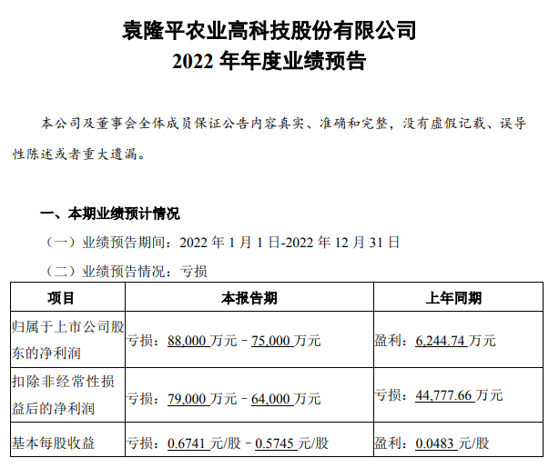 2月初,隆平高科發(fā)布2022年年度業(yè)績預(yù)告。報告顯示,2022年1月1日-2022年12月31日期間,隆平高科歸屬于上市公司股東的凈利潤虧損7.5~8.8億元,扣非凈利潤預(yù)計虧損6.4~7.9億元。
