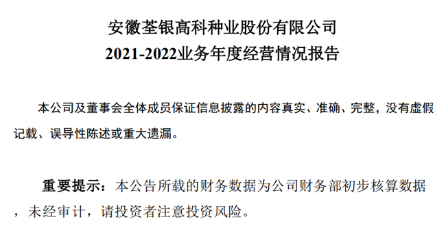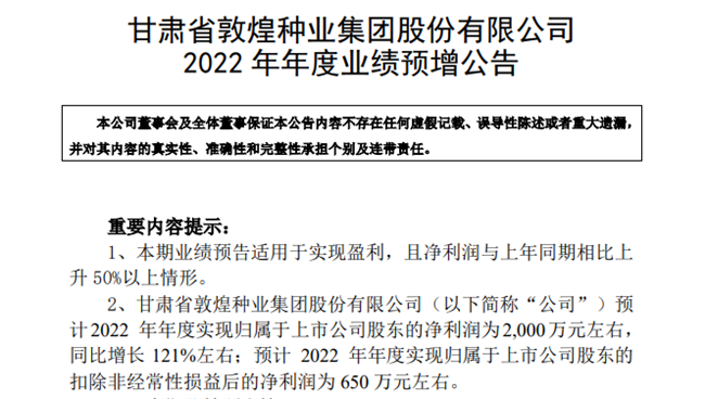近期,敦煌種業(yè)2022年年度業(yè)績預(yù)增公告披露(本期業(yè)績預(yù)告相關(guān)財務(wù)數(shù)據(jù)未經(jīng)年審會計師審計)。