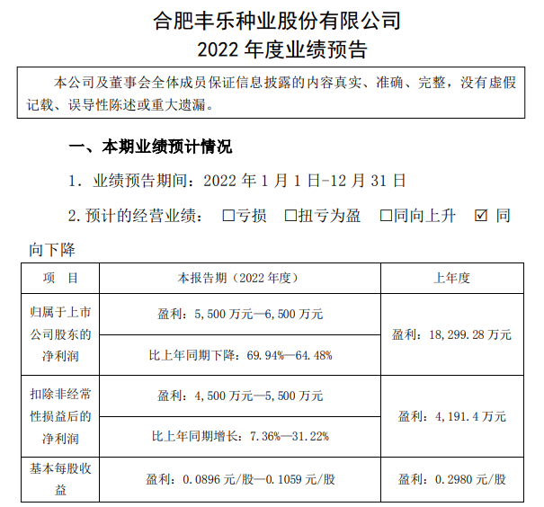 豐樂種業(yè):扣非凈利潤約4500-5500萬元,同比漲幅不大