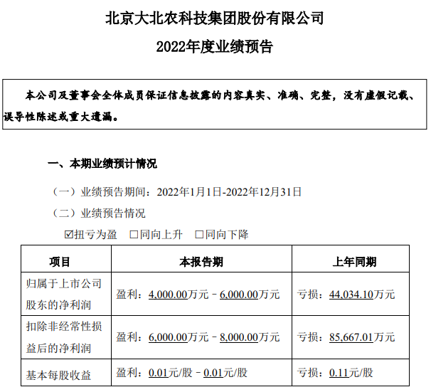 大北農(nóng)2022年年度業(yè)績預(yù)告顯示,大北農(nóng)歸屬于上市公司股東的凈利潤為4000-6000萬元,扣非凈利潤預(yù)計盈利6000-8000萬元,較上年同期虧損8.6億元。