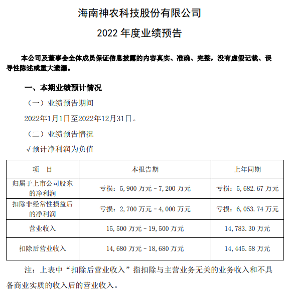 神農(nóng)科技:歸母凈利潤預(yù)計虧損5900萬元以上