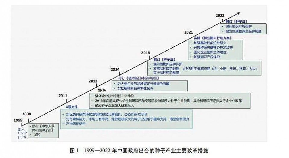 過(guò)去20多年,國(guó)家出臺(tái)一系列促進(jìn)種業(yè)發(fā)展的改革措施(圖1)。1997頒布《植物新品種保護(hù)條例》,中國(guó)政府開(kāi)始實(shí)質(zhì)性承認(rèn)育種者權(quán)利;1999年中國(guó)加入《國(guó)際植物新品種保護(hù)公約》(UPOV的1978版本),中國(guó)種業(yè)啟動(dòng)了現(xiàn)代化進(jìn)程;2000年頒布的《種子法》,種子產(chǎn)業(yè)開(kāi)啟了向商業(yè)化邁進(jìn)的大門(mén);此后,為了發(fā)展現(xiàn)代化種業(yè),政府又出臺(tái)了一系列政策與改革措施。