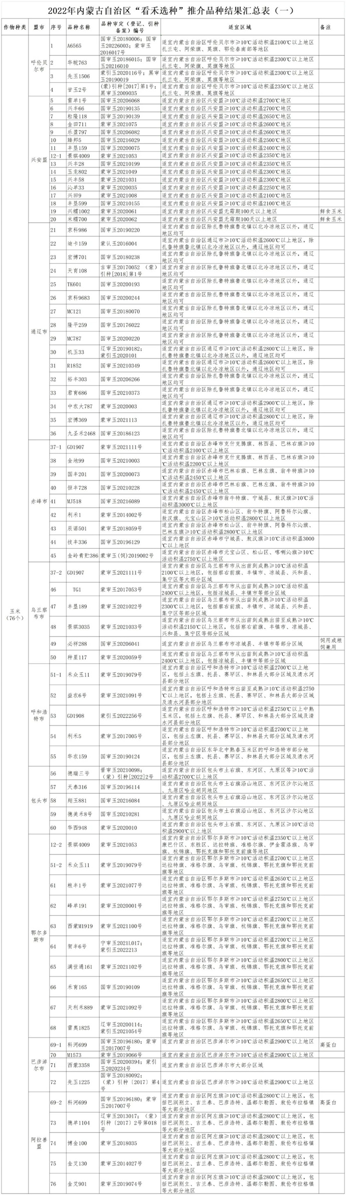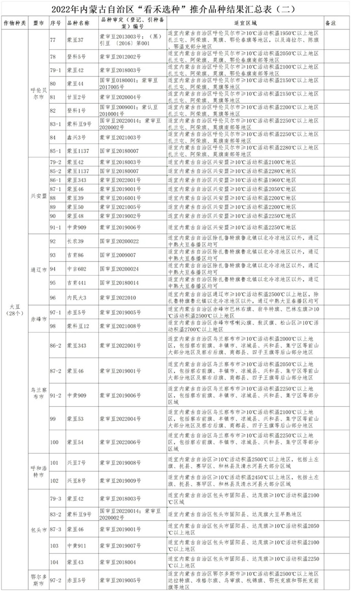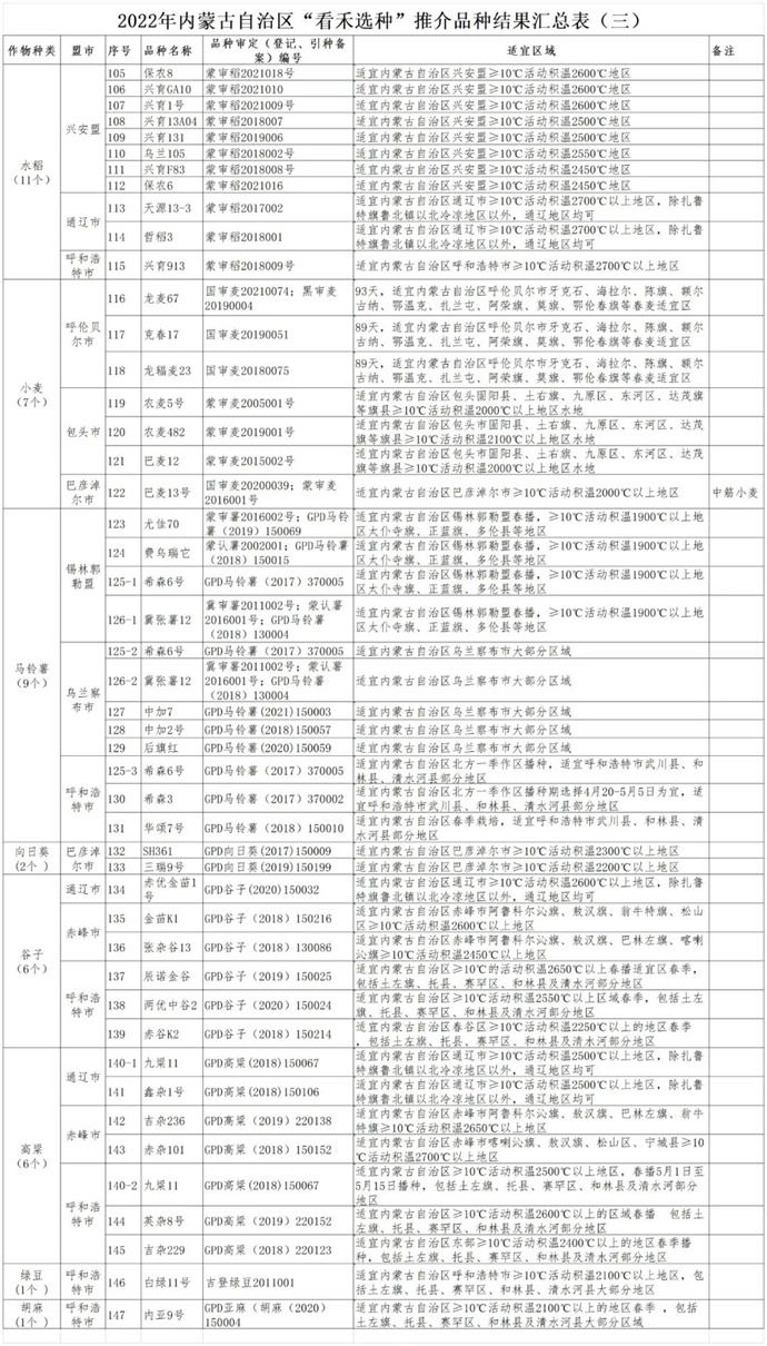 2022年,自治區(qū)農牧廳按照“建基地、引品種、促推廣”的工作思路,緊緊圍繞確保糧食安全,聚焦主要糧食作物,在全區(qū)建設“看禾選種”平臺60個,涵蓋了玉米、大豆、水稻、小麥、馬鈴薯、向日葵、雜糧雜豆等主要糧食作物和自治區(qū)特色優(yōu)勢作物,集中展示示范農作物品種2190個。通過組織現(xiàn)場觀摩、跟蹤評價、實收測產(chǎn)、專家論證等方式綜合評價,優(yōu)選出了適合全區(qū)不同區(qū)域種植的優(yōu)良農作物品種147個,其中玉米品種76個,大豆品種28個,水稻品種11個,小麥品種7個,馬鈴薯品種9個,向日葵品種2個,雜糧雜豆品種14個,供廣大農民朋友選種參考。