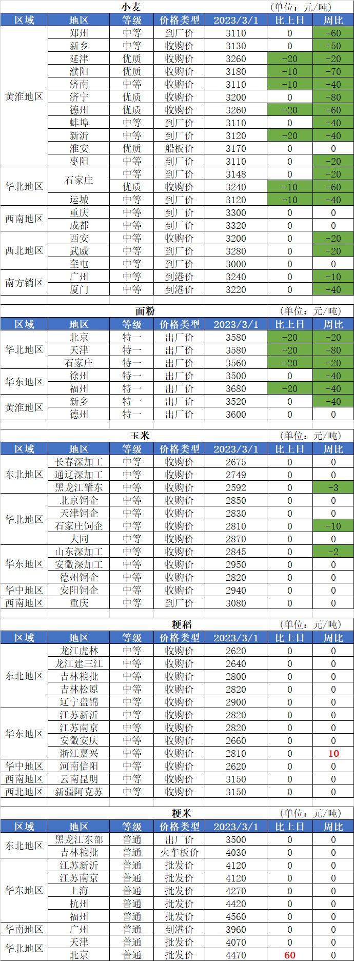 1、3月1日,最低收購價小麥拍賣共投放101465噸,全部成交。其中河南混合麥52059噸,成交均價2867元/噸;陜西混合麥21057噸,成交均價2962元/噸;甘肅白小麥8898噸,成交均價2954元/噸;江蘇混合麥11556噸,成交均價2813元/噸,白小麥7895噸,成交均價2899元/噸。