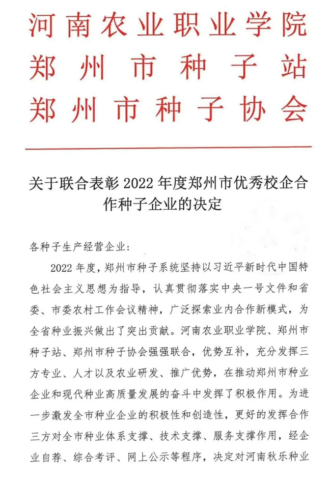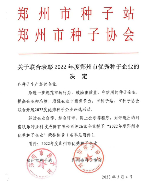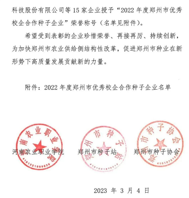 2023年3月4日,鄭州市種子協(xié)會(huì)“2022年度鄭州種子企業(yè)培訓(xùn)表彰會(huì)”在高新區(qū)麗致酒店隆重召開。