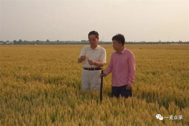 我和趙檀方老師在最新育成超早熟、高產(chǎn)小麥“齊民28號(hào)”田間