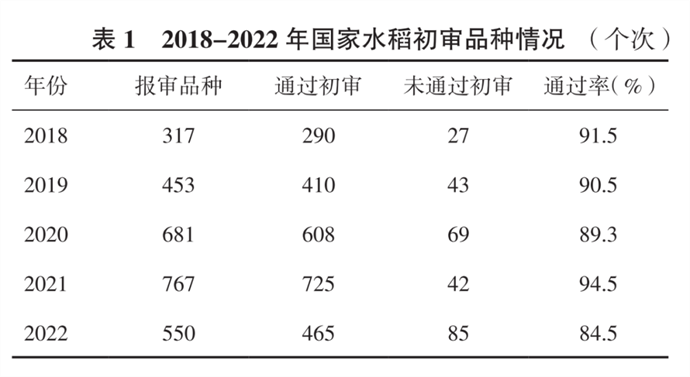 本屆專業(yè)委員會成立5年來,初審稻品種5批次,通過率分別為91.5%、90.5%、89.3%、94.5%、84.5%(表1),總體上呈現(xiàn)下降趨勢,其中2022年通過率為5年最低,主要是因為《國家級稻品種審定標(biāo)準(zhǔn)(2021年修訂)》提高了審定準(zhǔn)入門檻;審定委員準(zhǔn)確把握品種審定新形勢與新要求,全面執(zhí)行新修訂的審定標(biāo)準(zhǔn)。