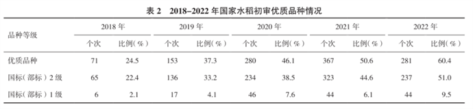 2018-2022年通過審定國標(biāo)(部標(biāo))2級以上的優(yōu)質(zhì)品種穩(wěn)定增加,2022年首次突破60%,達(dá)到60.4%,同比提高9.8個百分點,比2018年大幅提高35.9個百分點(表2)。