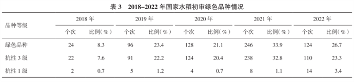 通過審定的綠色品種2019-2022年持續(xù)穩(wěn)定在20%以上,特別是抗性達(dá)到1級品種近3年持續(xù)增加,由2020年的4個增加到2022年的14個,占比由0.7%提高到3.4%(表3)。
