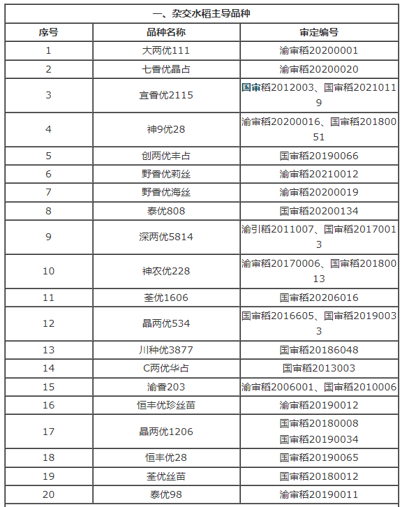 龍粳 31、中嘉早 17、川優(yōu) 6203、南粳 9108、晶兩優(yōu) 534、晶兩優(yōu)華占、吉粳 816、金粳 818、野香優(yōu)莉絲、綏粳 18、荃優(yōu) 822、遼粳 419、萬象優(yōu) 982、甬優(yōu) 1540、荃兩優(yōu)絲苗、南粳 5055、黃華占、旱優(yōu) 73、荃優(yōu)絲苗、晶兩優(yōu) 1212、晶兩優(yōu) 1377、中浙優(yōu) 8 號、荃優(yōu)華占、隆兩優(yōu) 534、隆兩優(yōu)華占、中早 39、多年生稻 23、川康優(yōu) 2115、南粳鹽 1 號。
