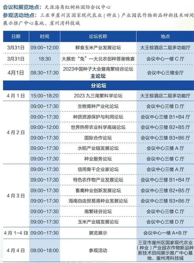 4月4日組織與會代表和海南省農(nóng)業(yè)農(nóng)村部門有關人員參觀大會種業(yè)成果展覽和品種田間展示,并到崖州灣科技城實地參觀考察。具體行程和線路安排,請仔細閱讀2023中國種子大會暨南繁硅谷論壇田間展示和參觀活動安排。(在參會指南中)