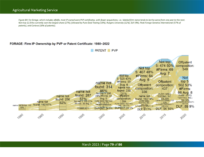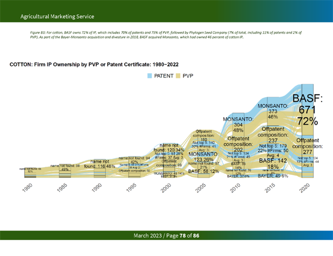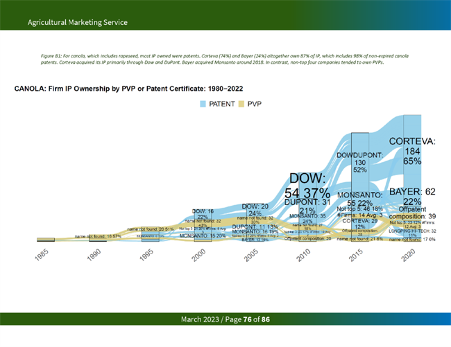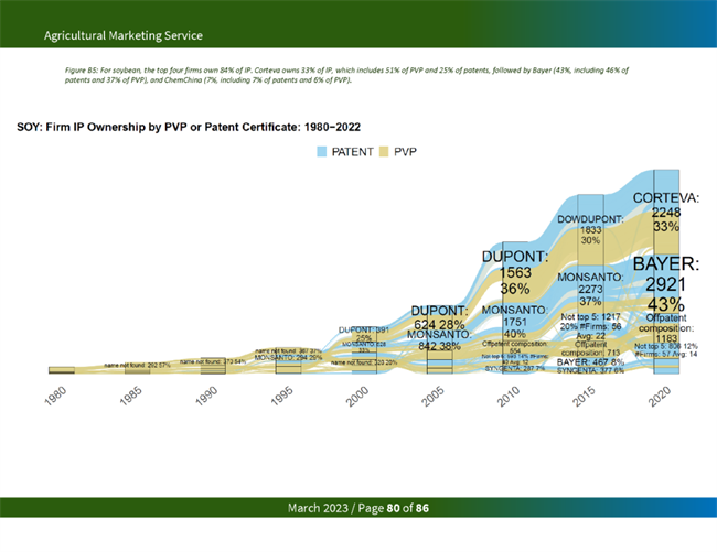 占主導(dǎo)地位的種子公司從知識產(chǎn)權(quán)限制中獲益匪淺。一項研究發(fā)現(xiàn),2015年,杜邦和孟山都公司擁有玉米和大豆品種所有專利和 PVP 權(quán)利的 80% 左右。在今天的美國主要商品中,美國農(nóng)業(yè)部發(fā)現(xiàn),前四大種子公司擁有 97%的油菜籽、95%的玉米、84%的大豆、51%的小麥和74%的棉花的知識產(chǎn)權(quán)。