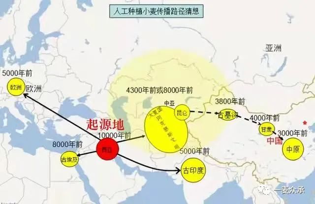 小麥形成后迅速傳播,成為世界許多古代文明的主體農(nóng)作物。小麥因起源于西亞新月沃土地帶也就是古代的兩河流域,它成為古巴比倫文明主體農(nóng)作物。小麥向南傳播到尼羅河領(lǐng)域,成為古埃及文明主體農(nóng)作物;向東南傳播到印度河流域,成為古印度文明的主體農(nóng)作物;向西北傳播到了歐洲,成為古希臘、古羅馬文明的主體農(nóng)作物;向東北傳播到伊朗和中亞地區(qū),成為古波斯文明的主體農(nóng)作物。小麥養(yǎng)育了四大文明古國中的三個,唯獨與中國沒有關(guān)系。距今7000年前后小麥傳播到中亞,之后沒有繼續(xù)向東傳播,在此滯留幾千年后,在距今4000-4500年終于傳播到中國。